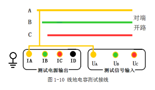 線地電容測(cè)試時(shí),例如測(cè)量線路A相對(duì)地的電容:
