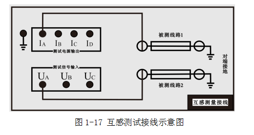 測(cè)試兩條輸電線路間的互感時(shí),被測(cè)線路測(cè)量端和對(duì)端三相分別短接,對(duì)端接大地,將儀器輸出A和電壓測(cè)量端子UA分別接入被測(cè)線路1和被測(cè)線路2的測(cè)試引下線,如圖1-17和1-18。